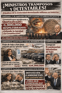 Capítulo I. 1° de septiembre del 2025, se gastan 1.3 millones de pesos en una pinche ceremonia en el Zócalo para agradecerle a Quetzalcóatl por haberle dado la vida a nuestro universo y a nuestras cosmovisiones, guau, por cierto a su pinche Corte asquerosa les valió absolutamente todo que por mandato constitucional la Suprema Corte de Justicia de la Nación debe ser laica y no fanática de ningún rito y de ninguna costumbre, pero ustedes, comenzando por el inepto e ignorante de su Ministro Presidente les valió gorro este mandato constitucional y terminaron haciendo lo que siempre hacen, lo que les dio su regalada gana.