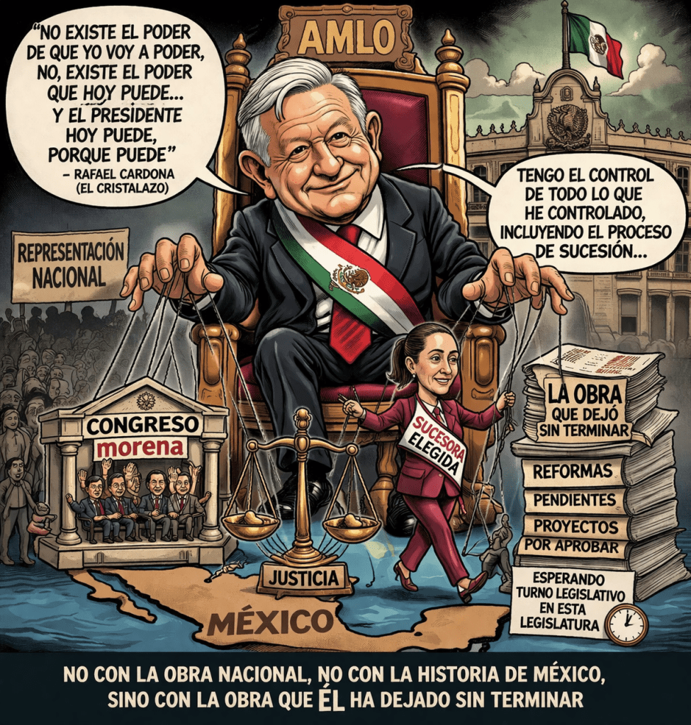 Todo el poder de este país está en las manos del presidente de la república, el poder que se puede ejercer es el único poder que existe, no existe el poder de que yo voy a poder, no, existe el poder que hoy puede y el presidente hoy puede, por qué, porque puede, pues porque para eso tiene la representación nacional y para eso tiene el control de todo lo que él ha controlado, incluyendo el proceso de sucesión presidencial y el impulso de la candidatura de una persona que el escogió para continuar con su obra, no con la obra nacional, no con la historia de México, no, con la obra que él ha dejado sin terminar en tres o cuatro pequeños aspectos, algunos de los cuales están esperando el turno legislativo en esta legislatura.