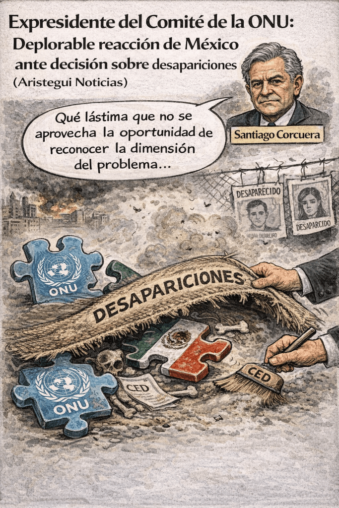El expresidente del Comité contra la Desaparición Forzada de la ONU (CED), Santiago Corcuera, consideró «deplorable» la respuesta del Estado mexicano ante la decisión del Comité contra la Desaparición Forzada de la ONU de llevar el tema de las desapariciones en México a la Asamblea General, tras la activación del artículo 34 de la Convención.