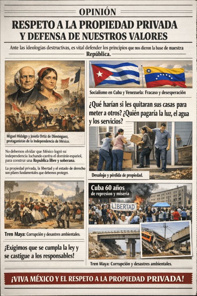 Es necesario entender que los mexicanos que tenemos conocimiento de causa de la historia de México, sabemos que nuestro país estaba gobernado indirectamente por España y es de ahí que vino un movimiento de independencia, el cual fue motivado por Miguel Hidalgo, por Doña Josefa Ortíz, de Puebla y todo un grupo de gentes que establecieron el modo para que hubiera un movimiento coordinado, en contra de la monarquía, ya que si algo no quería México era la existencia de virreyes o de “emperatrices”, entonces como es que ahora quieren cambiar todos los principios que nos dieron las bases para la creación de una república, esto sólo por caprichos y para ver cómo afectan la armonía entre los mexicanos, cuando promuevan la falta de respeto a la propiedad privada.