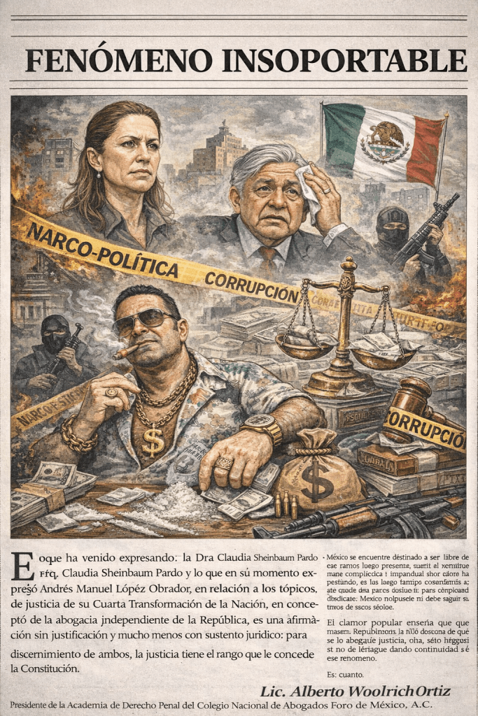 Además, es infecundo que sostengan que el neoliberalismo es el único responsable de la corrupción; la historia jurídica nacional nos ha informado que durante esas dos diferentes formas de gobernar, se unieron y posicionaron diversas medidas de complicidad, ello con el objetivo de otorgarle impunidad al responsable de ese infame fenómeno llamado narco-política; ahora más que nunca, resulta inestable el equilibrio para que la Dra. Claudia Sheinbaum Pardo dé continuidad a la ignorancia para la aplicación del Código Penal. Se puede resumir que ha llegado al máximo el hartazgo de la Nación.