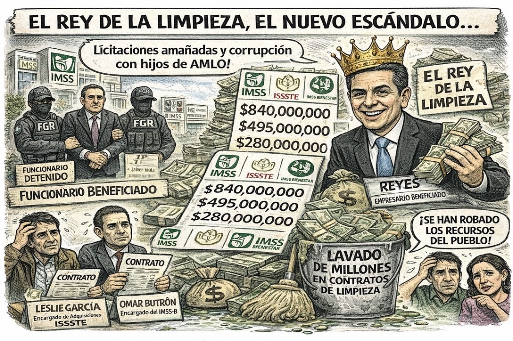 Este conocido como el rey de la limpieza, que ya les he hablado yo de este cuate Reyes, recibió contratos también del Instituto Politécnico Nacional, recibió contratos que se le dieron por parte del Instituto Politécnico Nacional y que a principios de mes un tribunal le dictó orden de aprehensión a un cuate que se llama Javier Tapia que era el encargado de los procesos de licitación en el Instituto Politécnico Nacional por desvío de recursos, bueno, ya agarraron a Tapia que fue vinculado a proceso por el desvío millonario a estas empresas dedicadas a limpieza, que hoy se llevan contratos multimillonarios en el ISSTE, en el IMSS y en el IMSS BIENESTAR, las mismas empresas, los mismos dueños, las mismas relaciones, estas que les conté el otro día, que están totalmente relacionadas con uno de los hijos de Andrés Manuel López Obrador.