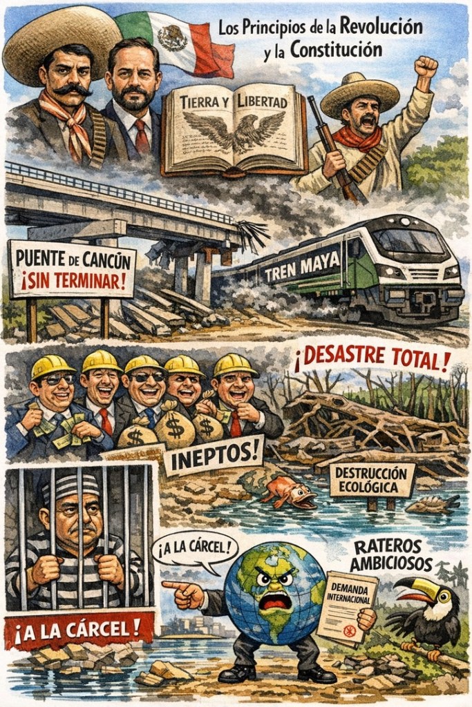 Y en otro tema es importante mencionar que sigue sin inaugurarse el puente de Cancún, el cual tiene una dimensión de 11 kilómetros, el cual al parecer tiene las mismas fallas que tuvo la construcción del Tren Maya, esto porque todo el trabajo ha sido manejado, diseñado y operado, por una bola de gentes ineptas, sin ética, sin sentido común y sin responsabilidad, y por lo cual el daño que han hecho lo deben pagar con la cárcel, porque esto es una traición a la naturaleza, a esta zona donde tomó millones de años en formarse, y donde llegaron una bola de rateros ambiciosos a destruir todo lo que tomó millones de años en construirse.